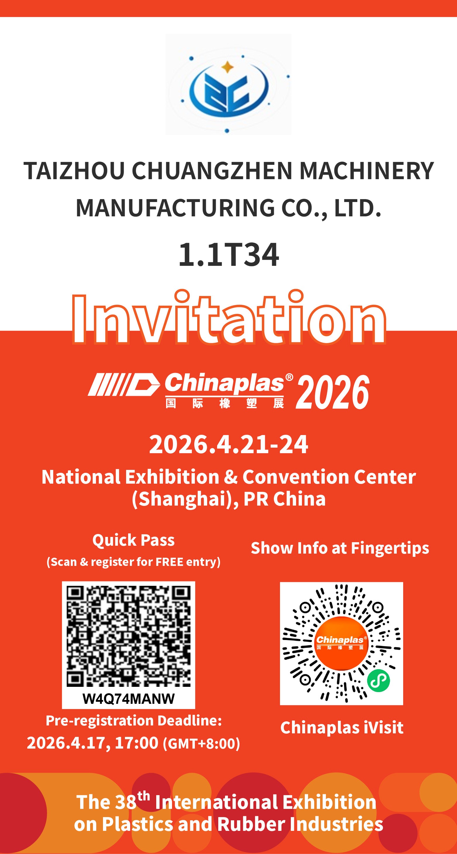 شركة تايتشو Chuangzhen لتصنيع الآلات المحدودة ، وهي شركة مصنعة لمعدات قولبة ضغط الغطاء ومقرها في منطقة هوانغيان، مدينة تايتشو، مقاطعة تشجيانغ، الصين، تفخر بالإعلان عن مشاركتها في معرض تشاينابلاس 2026 - المعرض الدولي الثامن والثلاثين للصناعات البلاستيكية والمطاطية.
